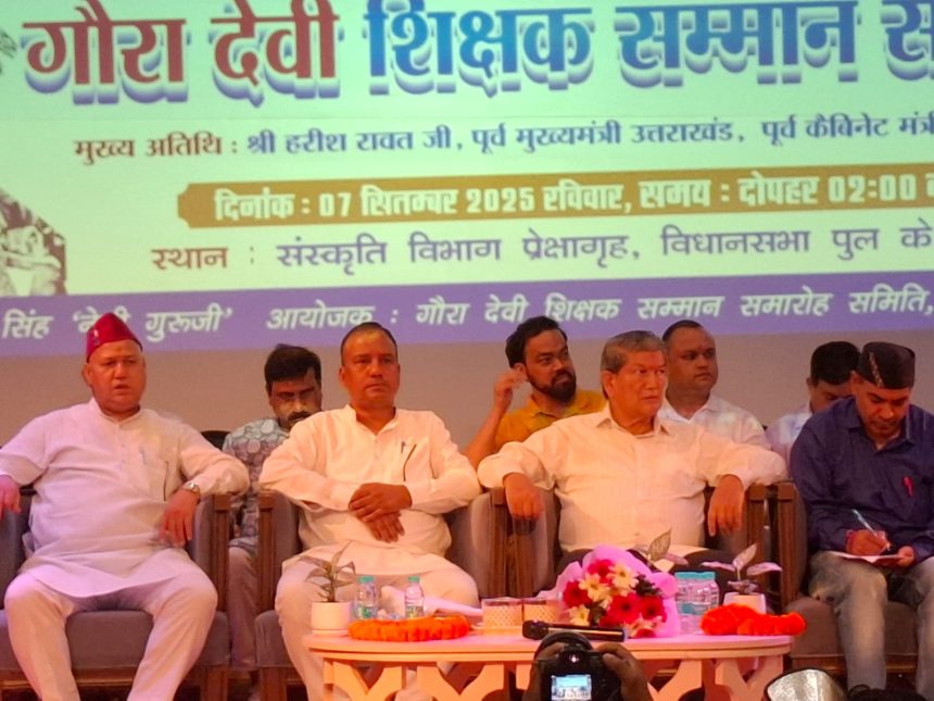 आज दिनांक 7 सितंबर 2025 को संस्कृति विभाग प्रेक्षागृह देहरादून में गौरा देवी शिक्षक सम्मान समिति द्वारा जनपद देहरादून के शिक्षकों को सम्मानित किया गया। समिति के मुख्य अतिथि पूर्व मुख्यमंत्री हरीश रावत जी एवं विशिष्ट अतिथि महावीर सिंह रावत पूर्व राज्य मंत्री , और शीशपाल सिंह बिष्ट प्रदेश प्रवक्ता कांग्रेस रहे । कार्यक्रम का शुभारंभ मुख्य अतिथियों एवं संगठन के पदाधिकारी द्वारा दीप प्रज्वलित कर किया गया तत्पश्चात बच्चों के द्वारा सरस्वती वंदना प्रस्तुत की गई। कार्यक्रम में महान दार्शनिक एवं भारत के द्वितीय राष्ट्रपति डाॅ सर्वपल्ली राधाकृष्णन के जीवनवृत्त पर प्रकाश डाला गया तथा चिपको वूमन गौरा देवी जी का संक्षिप्त जीवन परिचय की डाॅकोमेन्ट्री भी प्रदर्शित की गई।